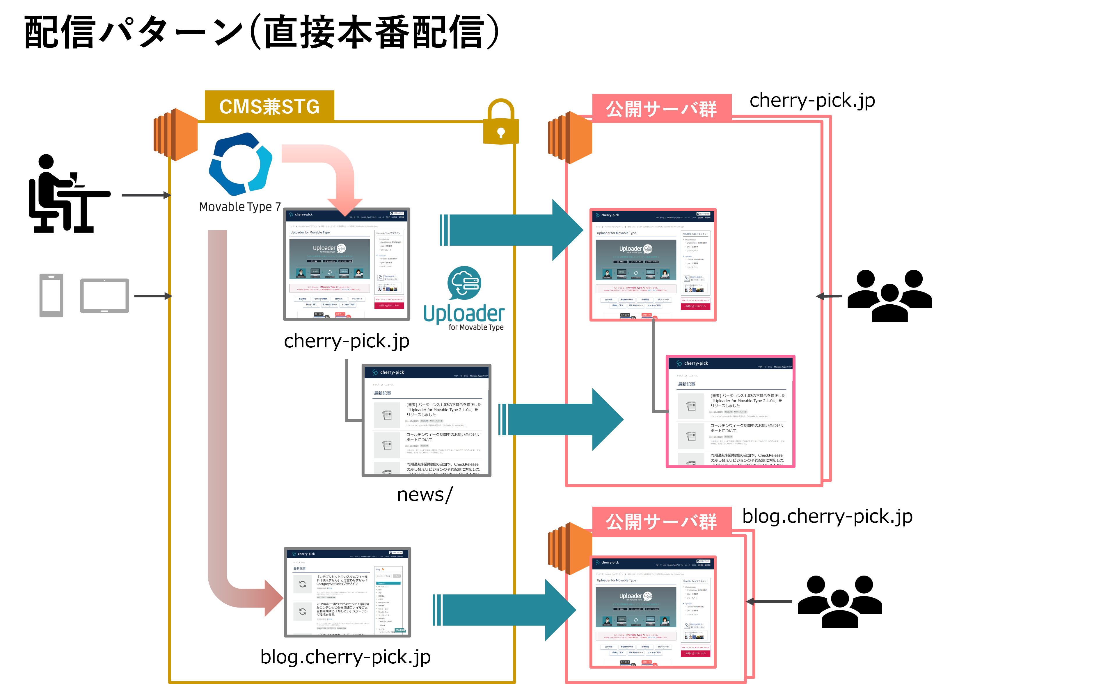 具体的には、まずMovable Typeを利用して社内などの安全な環境にCMSを構築し、ウェブページや記事を静的HTMLファイルとして生成します。そのうえで、Uploaderの配信機能を使い、生成された静的ファイルを公開サーバーへアップロードします。